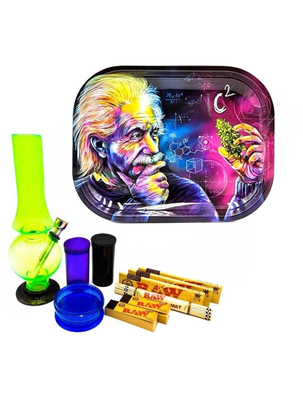Featuring a unique metal rolling tray inspired by Einstein’s famous equation — with a fun, classic twist — alongside a handy acrylic bong, this bundle blends creativity with everyday practicality. A perfect choice for beginners and seasoned smokers alike.