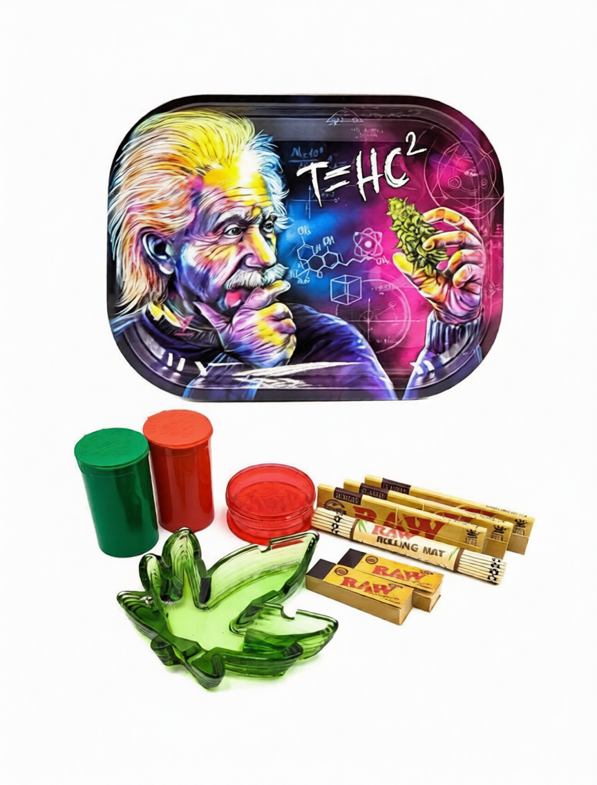 Upgrade your rolling setup with this premium smoking accessories bundle, featuring trusted RAW essentials and practical storage solutions. Designed for smooth, organised sessions, this kit combines quality rolling tools with a unique metal tray inspired by Einstein’s famous equation — finished with a classic stoner twist for standout style.