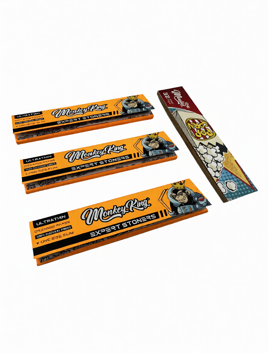 Enhance your rolling experience with the 3 Orange Monkey King Ultra Thin King Size Rolling Papers + 1 Double Tips Slim bundle, crafted by the iconic Monkey King brand in Barcelona.