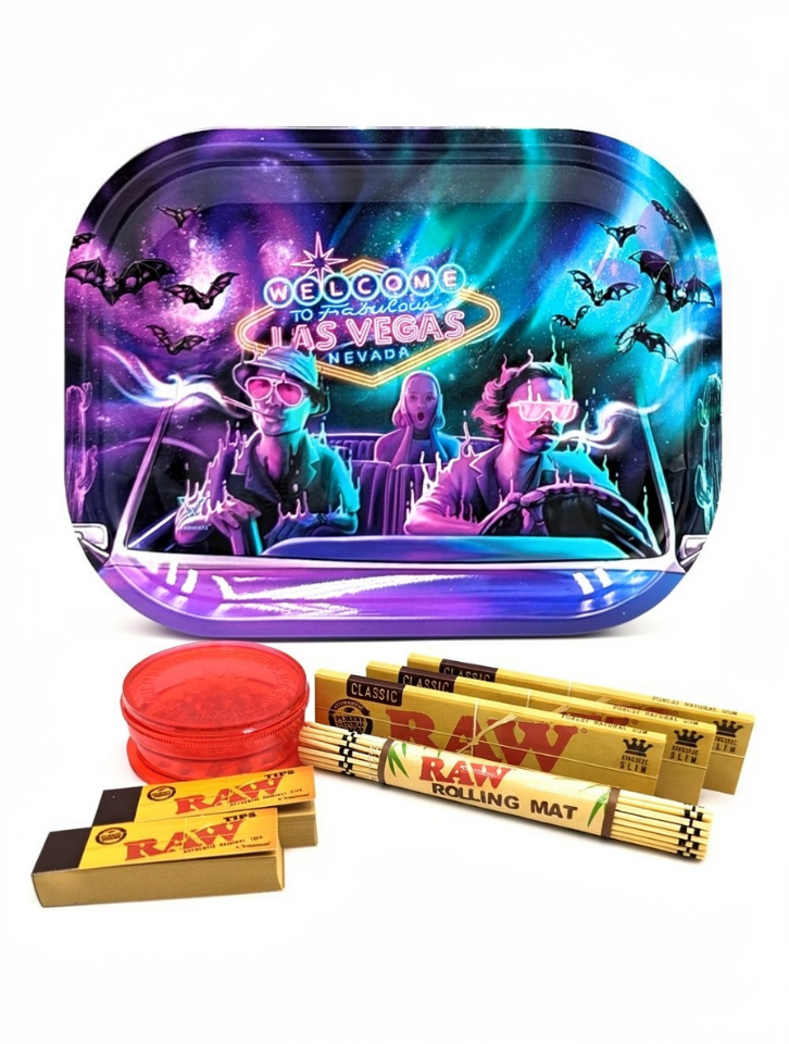This premium rolling kit includes a durable Las Vegas printed metal tray, 3-part grinder with stash compartment, RAW king size papers, roach tips, and a bamboo rolling mat — providing a stylish, practical, and ready-to-use rolling solution.