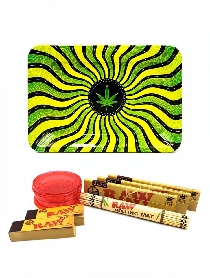 This all-in-one rolling kit includes a durable printed metal tray, 3-part grinder with stash compartment, RAW king size papers, roach tips, and a bamboo rolling mat — providing a stylish, practical, and complete rolling solution in one convenient bundle.