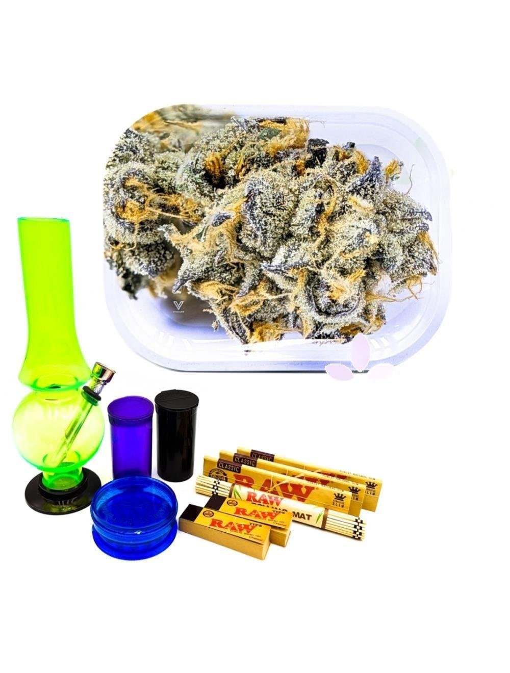 This Premium Bundle expands the smoking experience with a range of accessories - smoking essentials from top-tier brands like RAW, storage solutions by smell-proof containers and grinders for maximum convenience. It also includes a Metal Rolling Tray with Girl Scout Cookie print - a potent award-winning hybrid strain between OG Kush and Durban Poison. Hence, the tray makes a perfect accessory for users of the strain, and its round corners also make it easy to clean up! Add a handy Acrylic Bong to the collection; this bundle is a stoner's best friend.